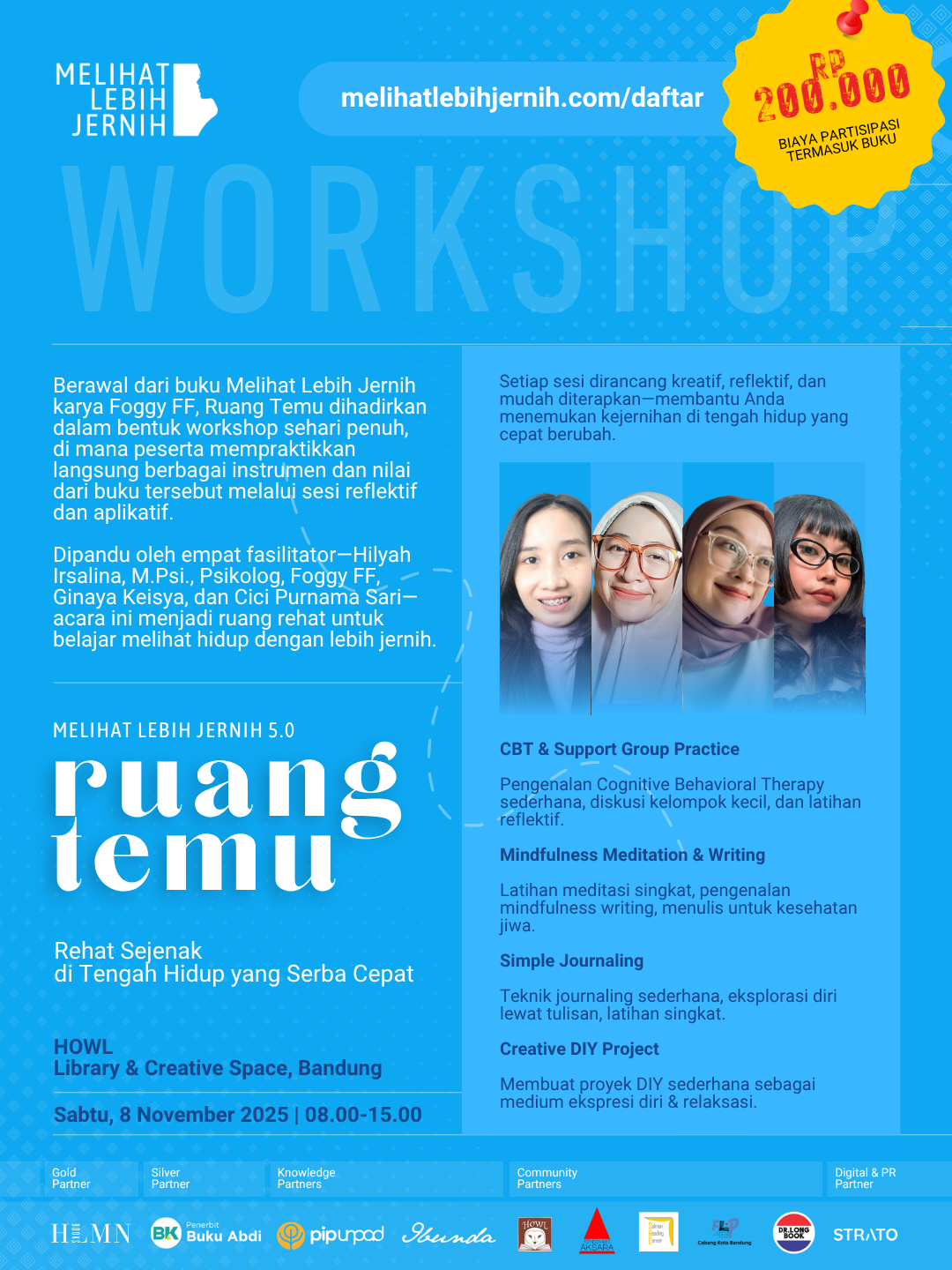 Program unggulan kampanye kesehatan mental Melihat Lebih Jernih hadir dengan format workshop sehari penuh. Acara ini menghadirkan isi buku Melihat Lebih Jernih ke dalam bentuk pengalaman nyata yang bisa dirasakan langsung oleh setiap peserta. Buku ini membahas perjalanan memahami kesehatan mental dan cara menemukan kejernihan di tengah rutinitas. Melalui workshop, gagasan tersebut tidak hanya berhenti secara tekstual, tetapi diwujudkan dalam kegiatan praktis.